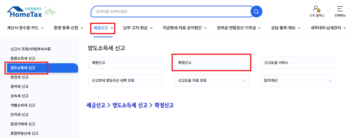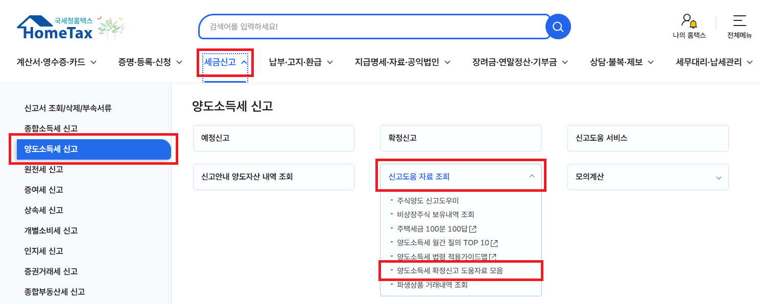 👉 홈택스 로그인 → 세금신고 → 양도소득세 신고 → 신고도움 자료 조회 → 양도소득세 확정신고 도움자료 모음